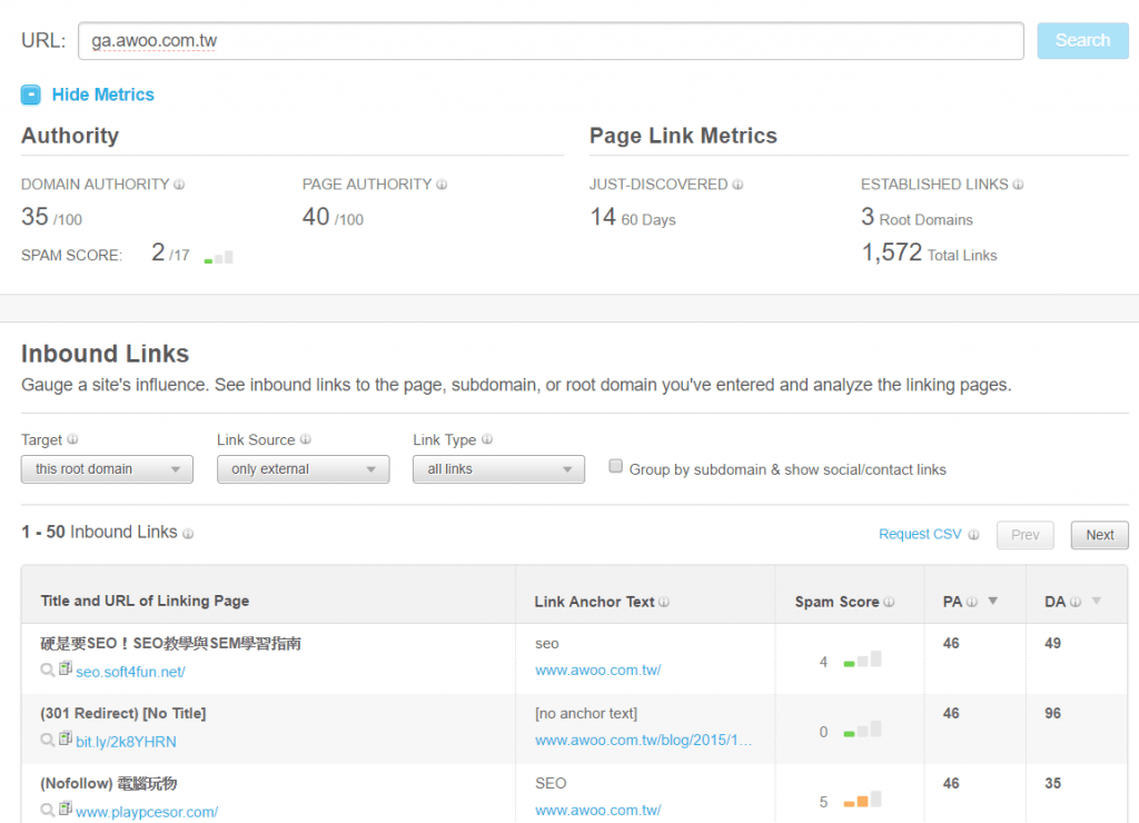 用OpenSiteExplorer 你只要輸入對手的網址,它的外鏈清單就可以一覽無遺,從這個清單中你可以看到對手的PR 策略、媒體經營策略、他們是否有投稿到哪些媒體、有在哪些論壇露出、有跟哪些博客合作.. 等資訊你都可以得到。