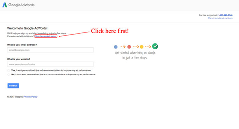 3. 當歡迎頁面Welcome to Google Adwords!加載完成后,點擊藍色鏈接Skip the guided tour(參考上圖)。
